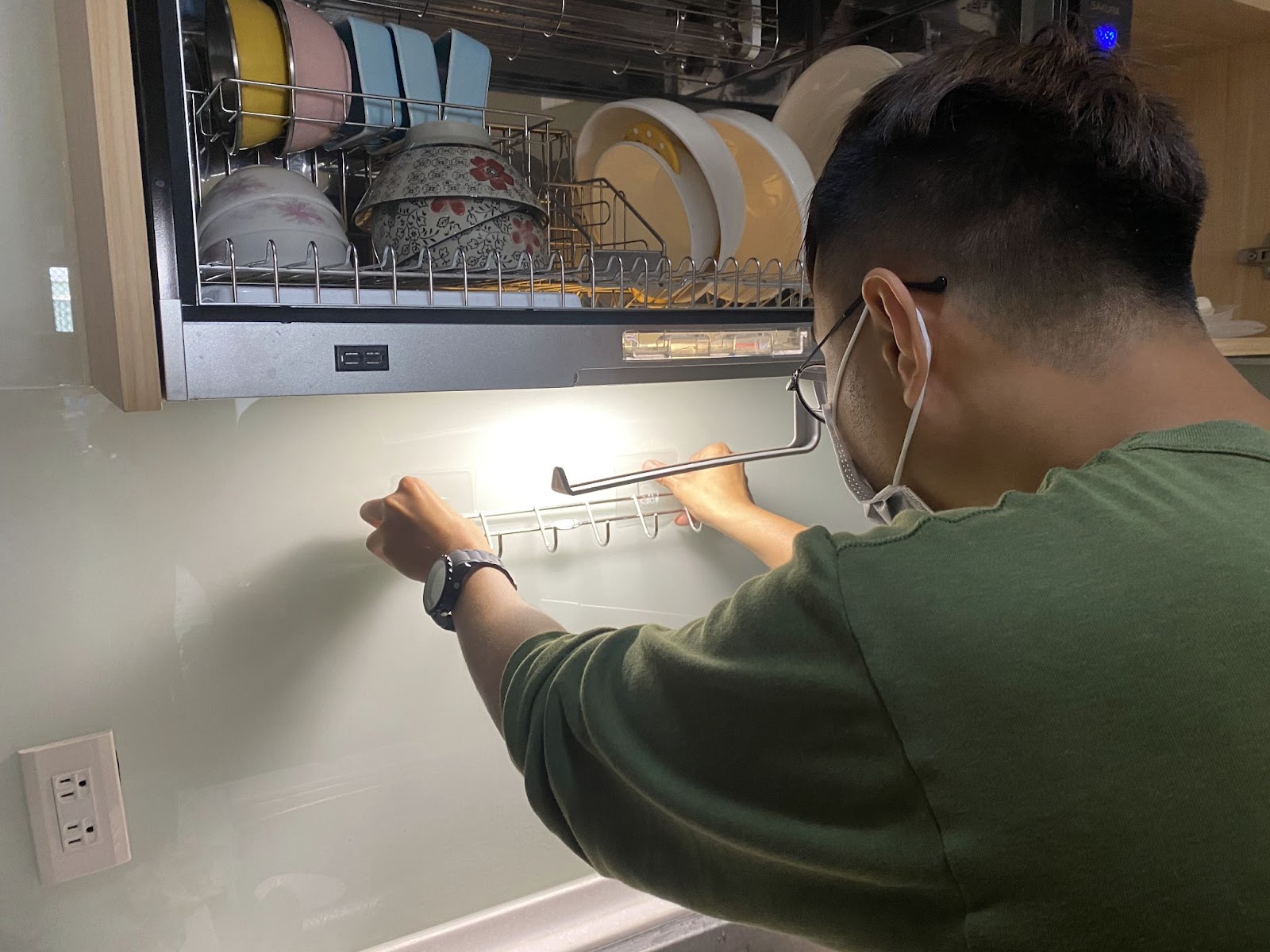 同事先擦拭牆面,再根據要掛放的物品&屋主順手度,找出合適的位子。