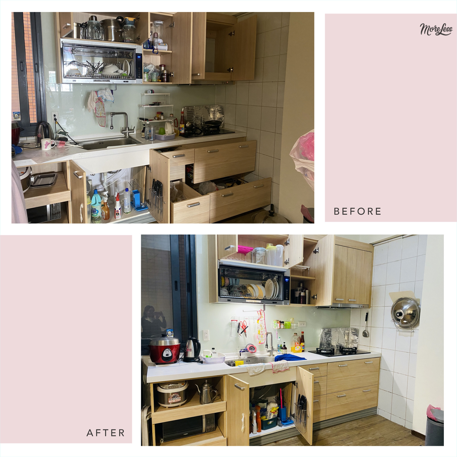 老樣子,我先下架各區物品讓Jenny篩選,挑出不需要、過期的用品與食品,再細分類物品,然後搭配預備好的收納架,根據Jenny一家習慣且順手的方法擺放,花費時間約4小時。